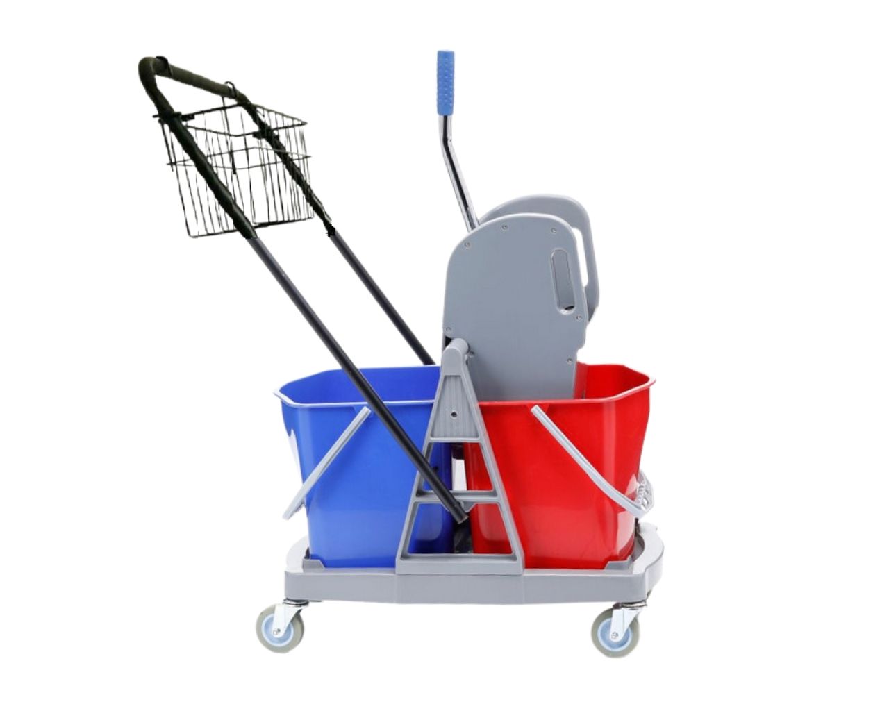Wózek serwisowy HFW102 do sprzątania, dwuwiadrowy, 2× wiadro 17 l, koszyk metalowy czarny, prasa do mopów