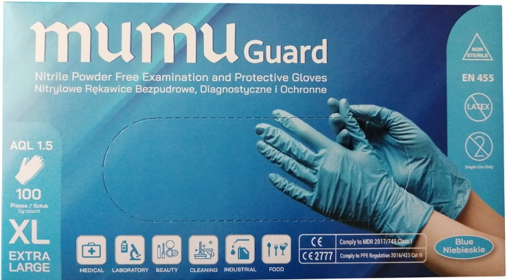 Rękawiczki NItrylowe Mumuguard niebieskie zapewniają maksymalny komfort i bezpieczeństwo użytkownika. Rękawice są bezpudrowe co zmniejsza ryzyko wystąpienia uczulenia. Wyrób medyczny klasy I, reguła V oraz środek ochrony indywidualnej kategorii III, typ B, dzięki tym właściwością rękawiczki nitrylowe easycare znajdą zastosowanie w salonach z branży beauty, salonach tatuażu jak i w służbie zdrowia, przemyśle chemicznym i spożywczym.
